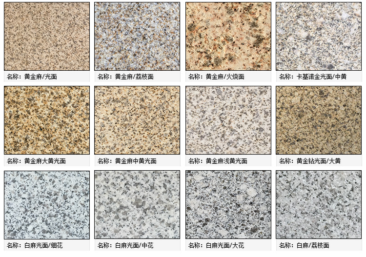 本公司主营: 黄金麻、白麻、卡基诺金、黄锈石、黄金钻、湖北黄金麻、随州白麻、芝麻白、g603、卡拉麦里金等产品的各种规格的光面、火烧面、荔枝面、喷砂面、拉丝面、机切面、斧剁面、自然面、蘑菇面、菠萝面、路边石、线条及各种异形石雕加工。生产的石材规格齐全、做工精细,被广泛用于外墙干挂、广场地铺、市政园林、建筑工程、环境景观异形石材等各类建筑墙体、地面的装饰装修。产品颜色稳定,产量大,品质优。畅销全国各地并出口部分国家。被大型建筑工程广泛使用并得到国内外客户的信赖和好评。